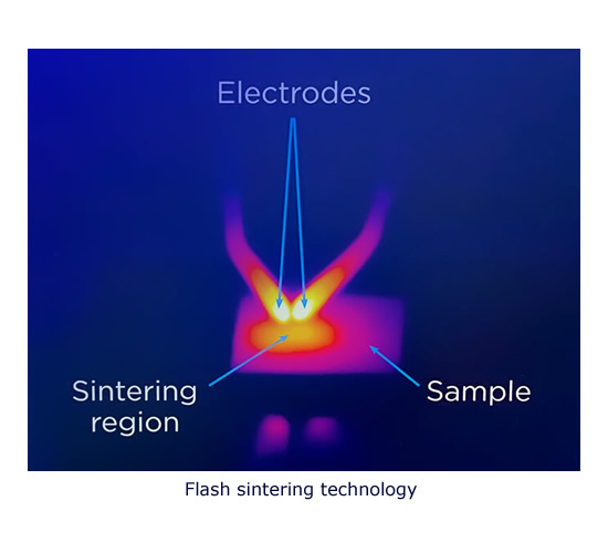 Flash Sintering (FS), also known as Field-Enhanced Sintering (FES), is an advanced sintering technology that involves the application of a direct electrical field via customized electrodes to a material body during the sintering process. Flash Sintering accomplishes its remarkable heating rate by dissipating heat directly inside the ceramic. This reduces the processing time and furnace temperatures from those required by conventional sintering, increasing throughput and productivity. When implemented properly, Flash Sintering also enables a high degree of microstructural control, which can positively influence the performance of ceramic components.